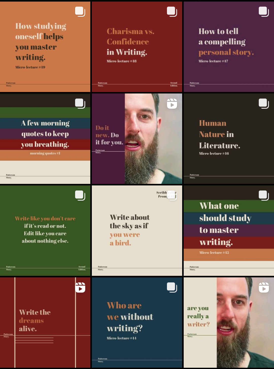 Since then, I have spent a great deal of time thinking about everything to do with writing. I’m not that worried about doing it the way anyone else would do it. I just think about it the way that makes sense to me. For a long time, I just thought these thoughts to myself. But a few years back, when Covid had just hit, and my heart had just been broken, I decided to start telling the world my ideas, on Instagram (@patteron.story).